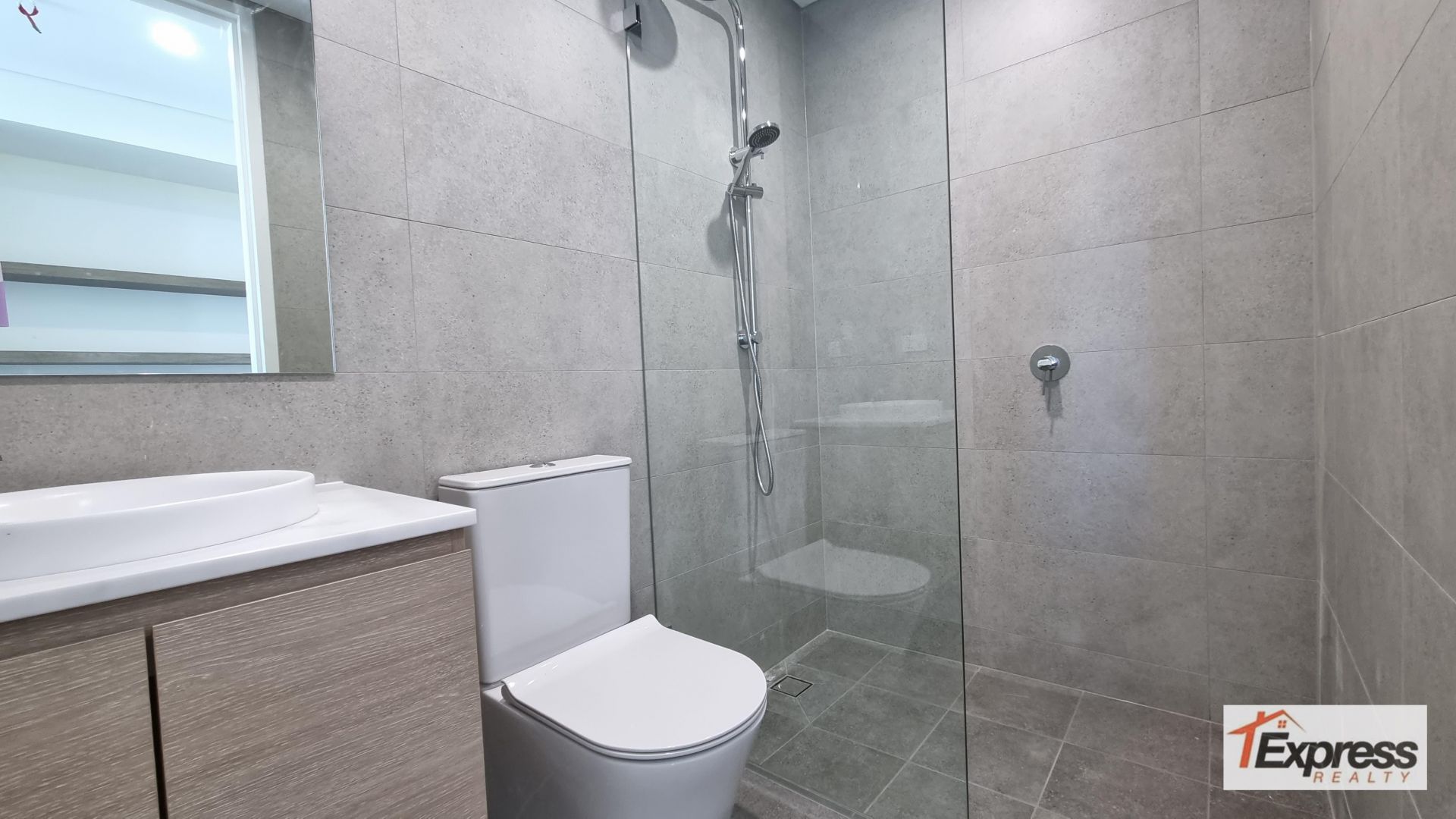 - Sleek fully tiled bathroom with bathtub