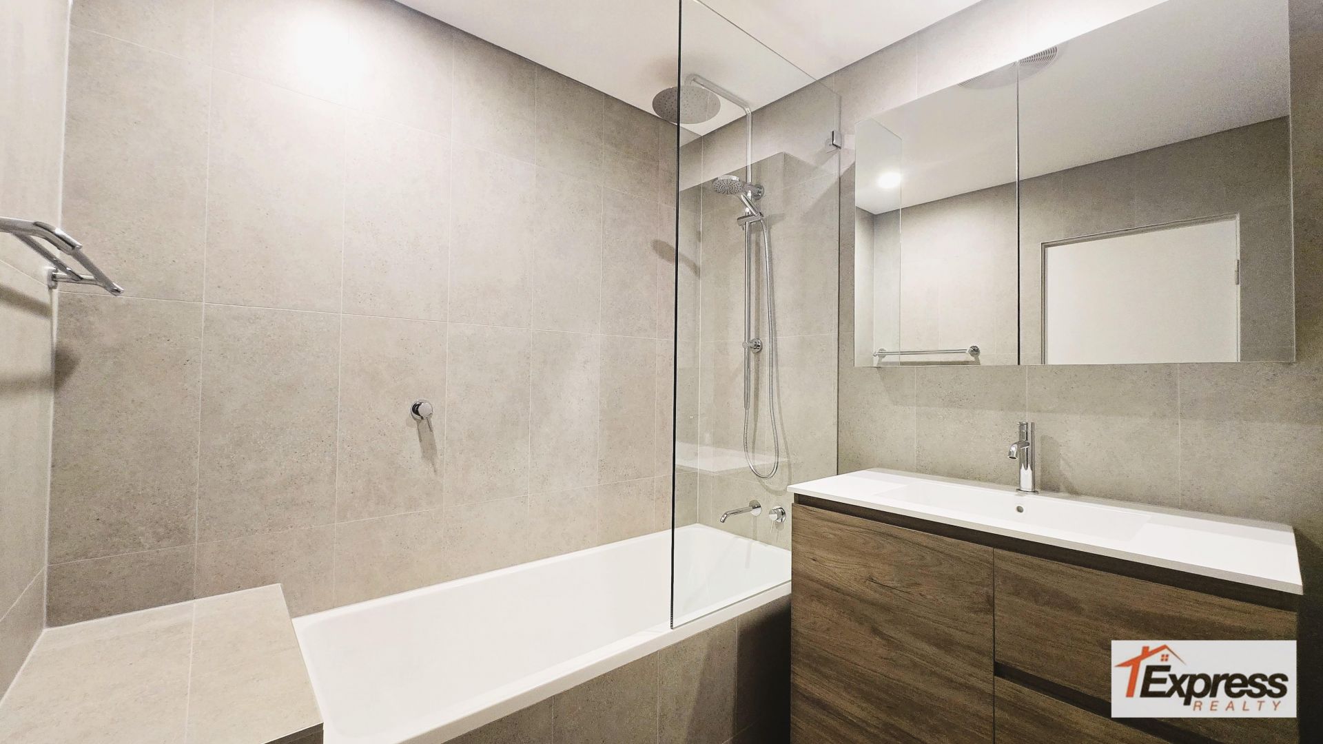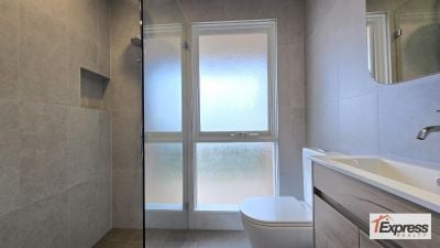 - Sleek fully tiled bathroom with bathtub